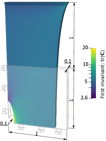 ![\Psi(\mathbf{C}) = \frac{\mu}{2}\left[I_1 - 3 - \log(I_3)\right] + \frac{\lambda}{4}\left[I_3 -1 -\log(I_3)\right] \,.](../../_images/math/d4ffd6748f21f34f2cc68832fa1454c8589d507b.png)